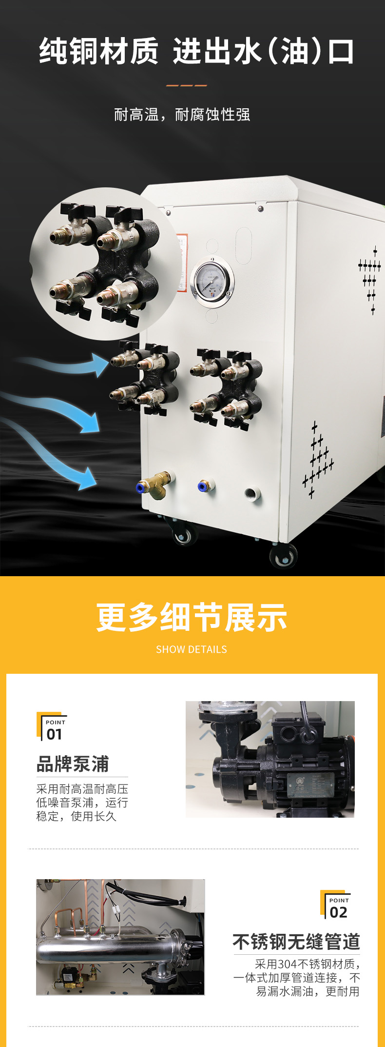 溫度控制機在其他行業的運用則是設備構成的必然條件,叫法也不同。在PVC片材輥輪控溫中叫油加熱器,在擠出機設備中叫溫控裝置,在橡膠密煉機設備中叫溫度控制系統或叫溫控機,這些設備中基本上是一個先快速升溫,然后是保溫的過程。而在橡膠設備中升溫后還需要長期執行一個降溫冷卻的過程。